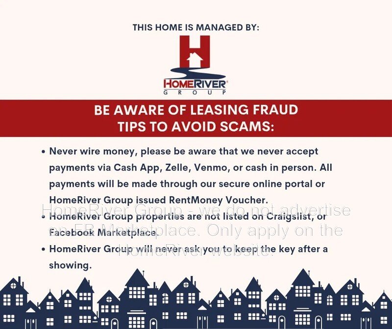 HomeRiver Group does not advertise properties on Craigslist, LetGo, or other classified ad websites. If you suspect one of our properties has been fraudulently listed on these platforms, please notify HomeRiver Group immediately. All payments related to leasing with HomeRiver Group are made exclusively through our website. We never accept wire transfers or payments via Zelle, PayPal, or Cash App. Lease your home safely through www.Homeriver.com or with the assistance of a licensed HomeRiver Group leasing agent. All leasing information contained herein is deemed accurate but not guaranteed. Please note that changes may have occurred since the photographs were taken. Square footage is estimated.